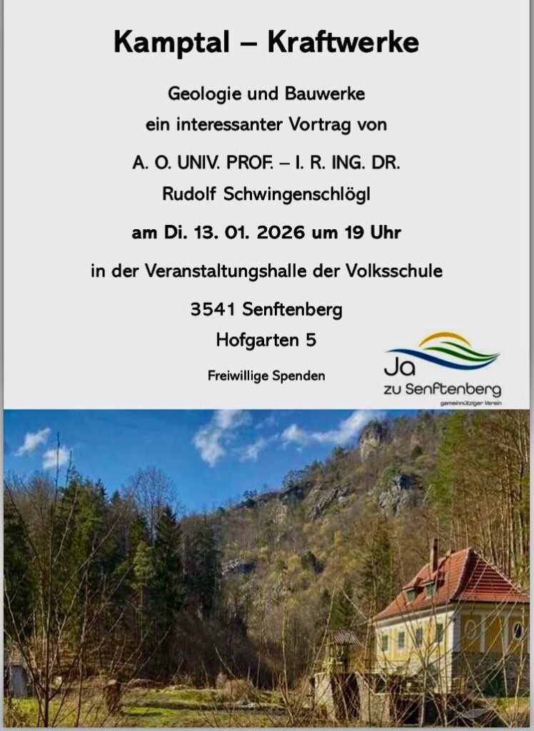 Eine Veranstaltung zum Thema Geologie und Bauwerke: Kraftwerke im Kamptal und ihre Geschichte. Am Dienstag 13.Jänner 2026 lädt der Verein zu einem spannenden Vortrag von Univ. Prof. a.D. Dr. Rudolf Schwingenschlögel